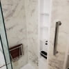 A sturdy shower seat provides a secure place to relax, making your bathroom a safer